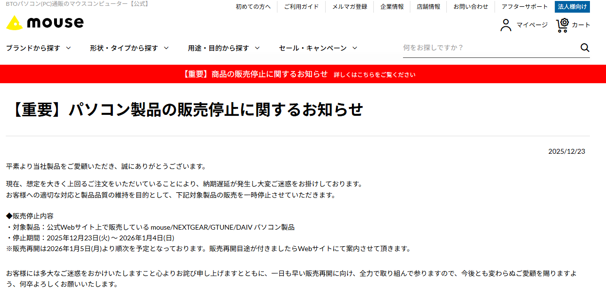 先日から、PCのパーツ高騰が激しくなっていますが、雑誌記事などで「早めにパソコン買っとけよ」と促していたマウスコンピューターが想定を上回る注文を捌ききれなくて全製品の販売を停止した模様です。