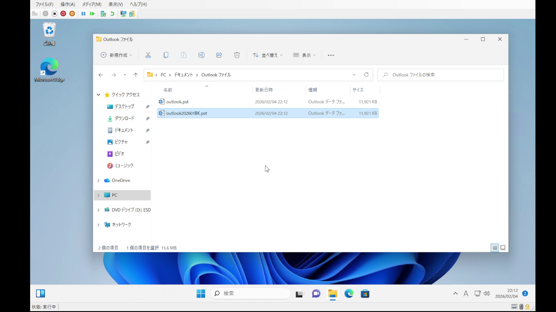 Outlookのデータファイルは、通常1つのファイルで管理されています。