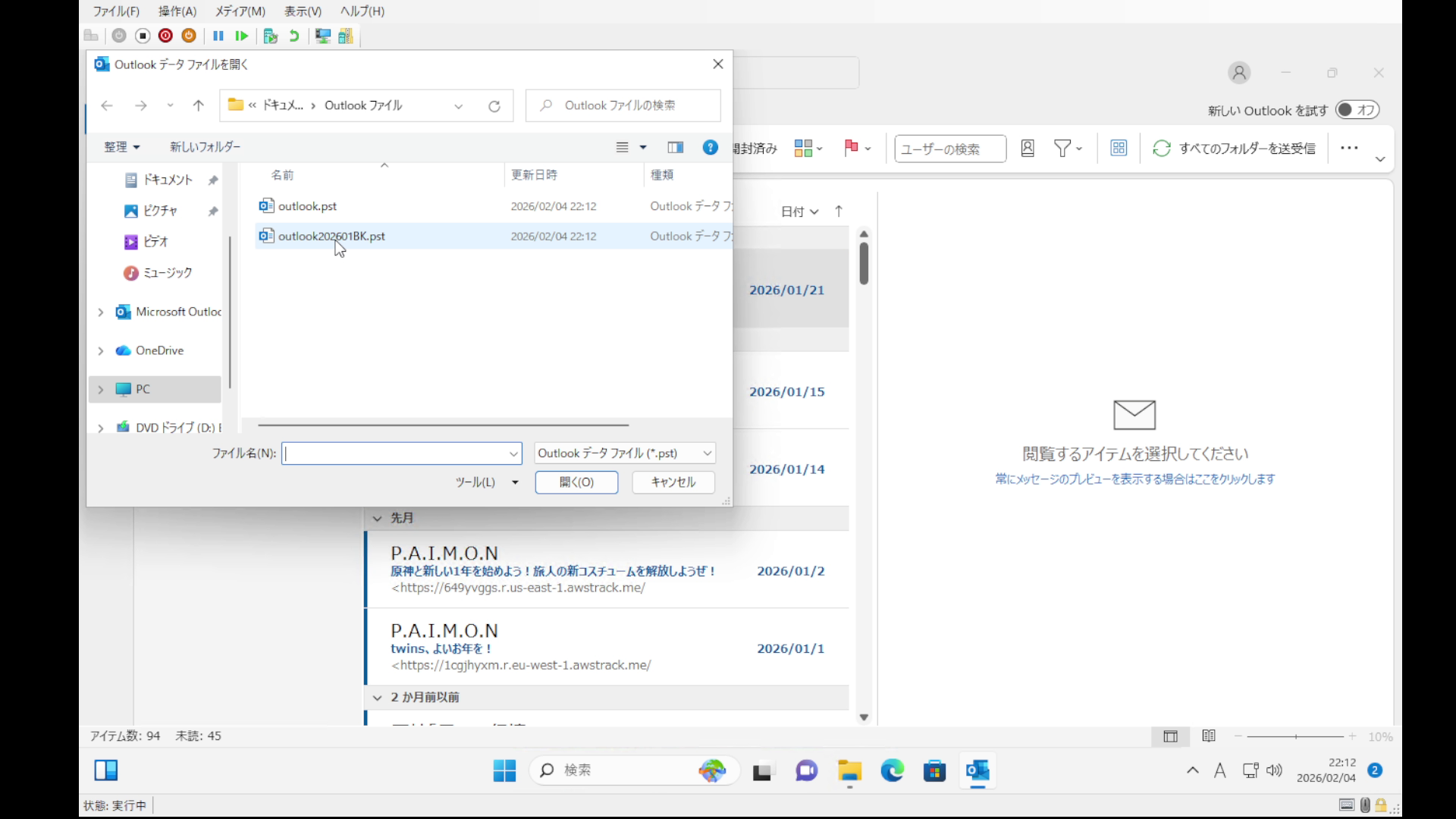 データファイルの場所は通常「Documens」-「Outlookファイル」フォルダにあります。