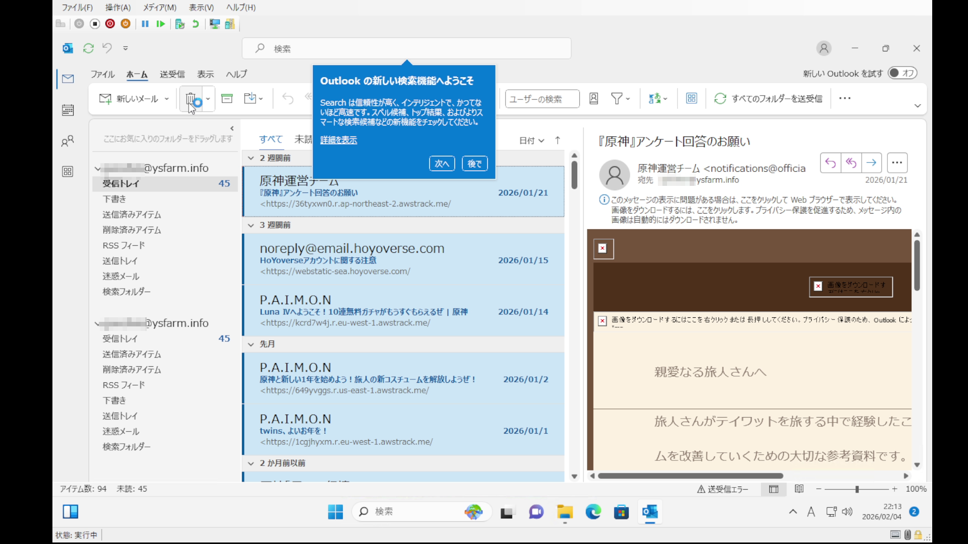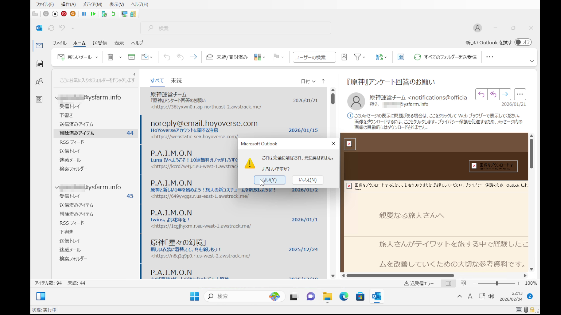 データファイルが必要以上に肥大化するとOutlookのデータ読み込みに支障が出る可能性がある