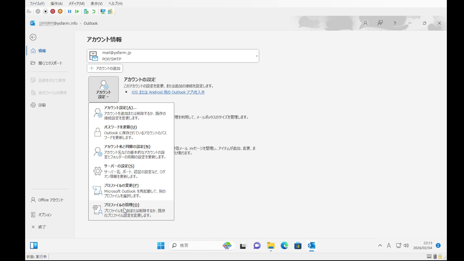 「ファイル」-「アカウント設定」-「プロファイルの管理」でメール設定を開きます。