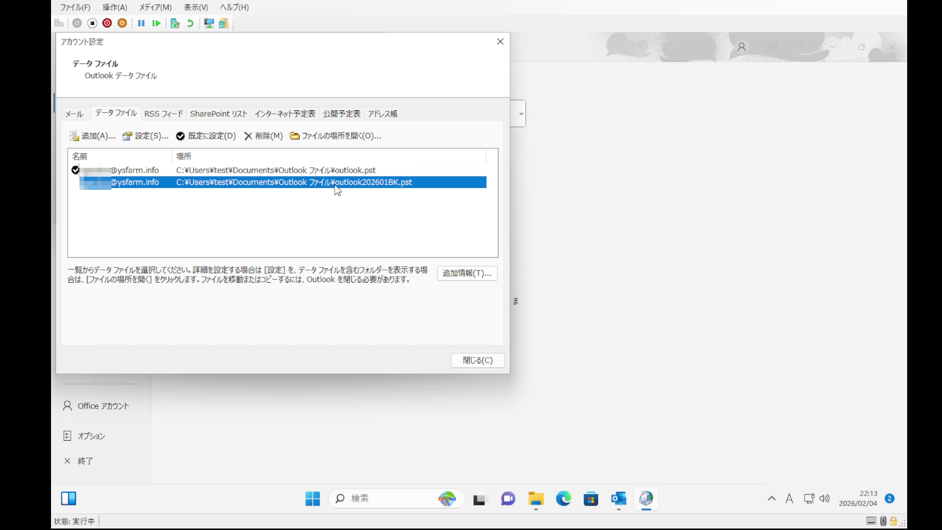 データファイルが2つ見えているのでバックアップしたデータファイルここでは「outlook202601BK」という方を選択して「設定」ボタンを押します。