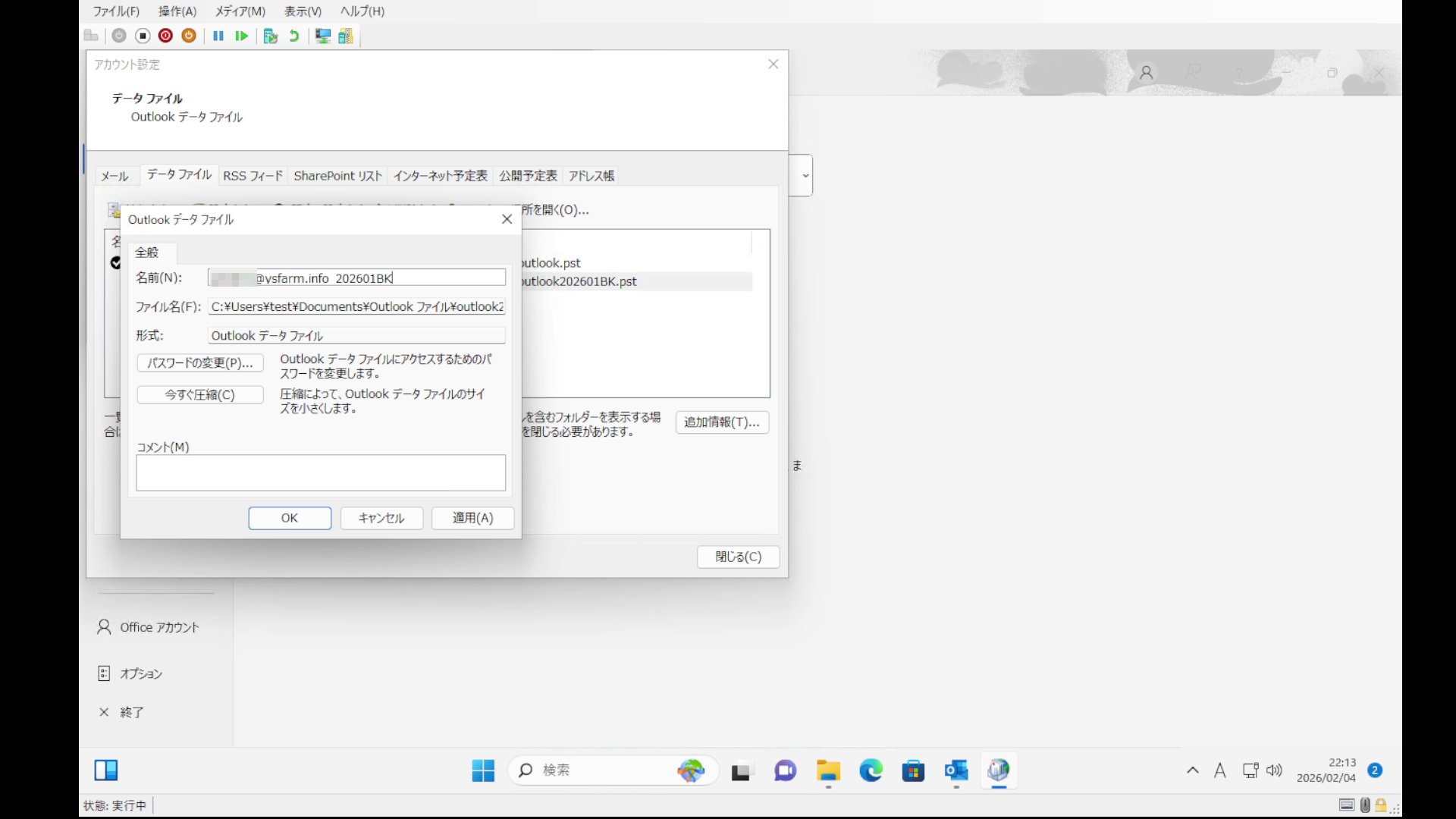 こちらはOutlookの左カラムに見えているデータファイルの名称なのでわかり易い名前に変更します。