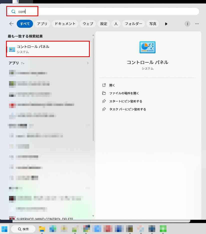 スタートボタンから「cont」と入力するとコントロールパネルが出てくるので開きます。