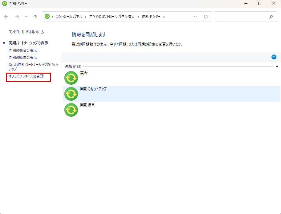 オフラインファイルウィンドウが開いたら、以下の箇所を確認してください。