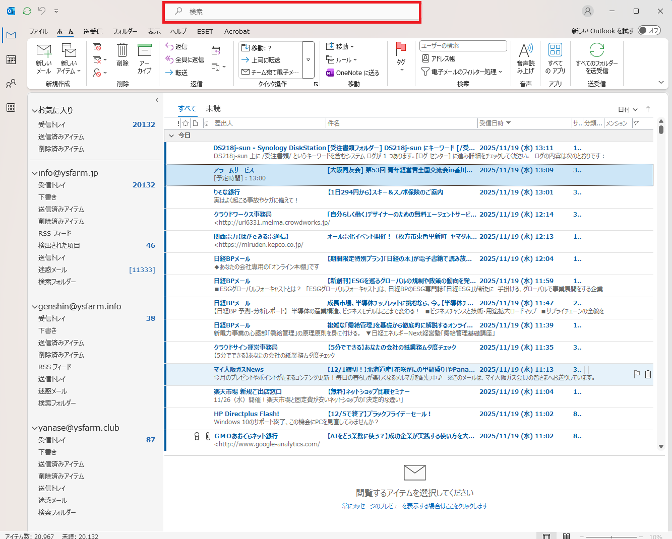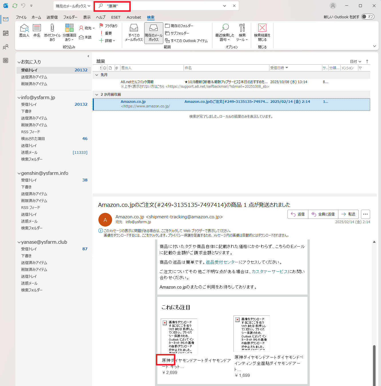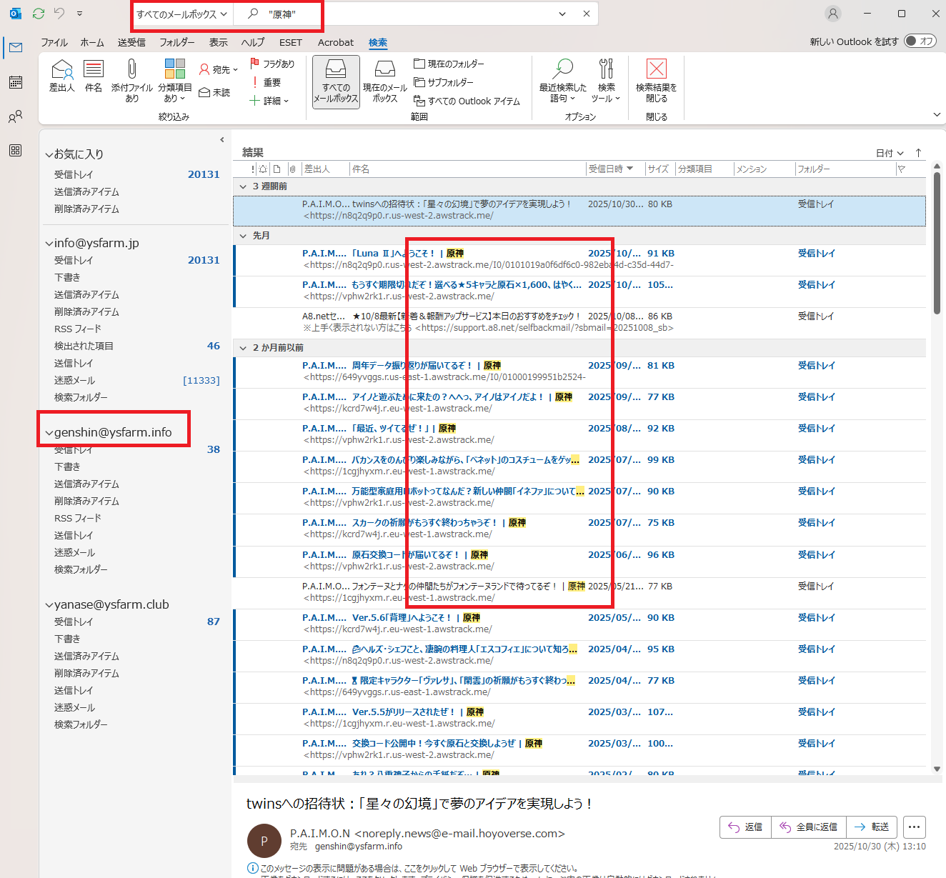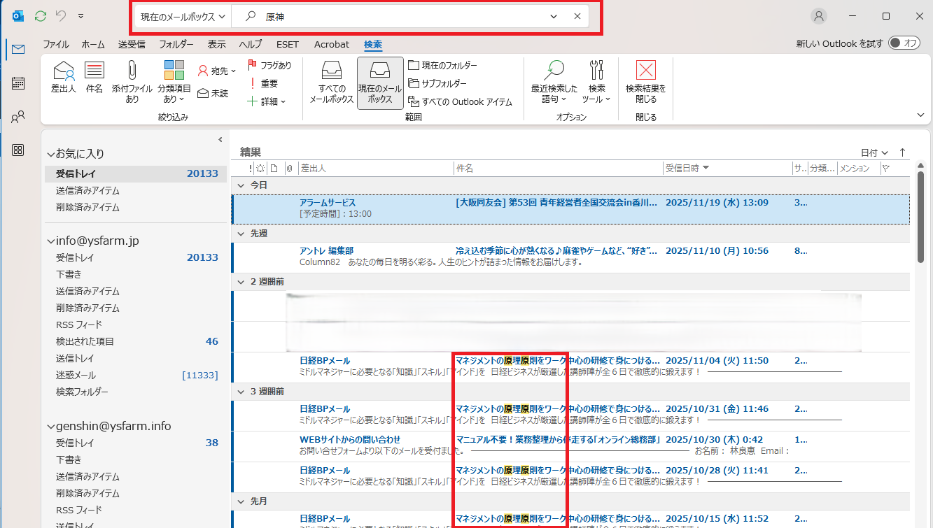 今度は「info@ysfarm.jp」以外のメールボックスからも検索して結果を表示しました。