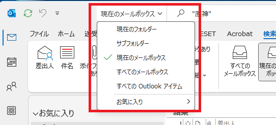 また、検索窓の左にある「現在のメールボックス」は検索する対象を指しています。