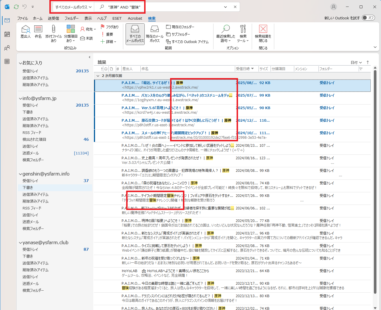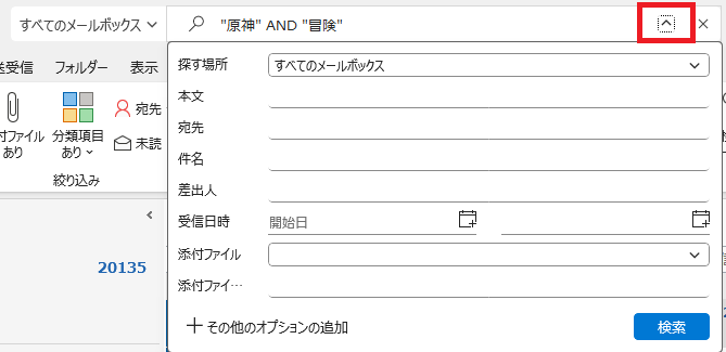 すべてのメールボックスを対象に”原神” または ”冒険”を含む(完全一致)で、検索しました