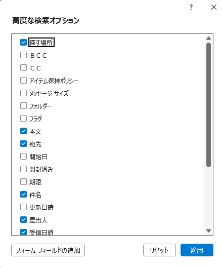 受信日時の範囲を指定したり、添付ファイルのアリナシをピンポイントで検索したりできます。