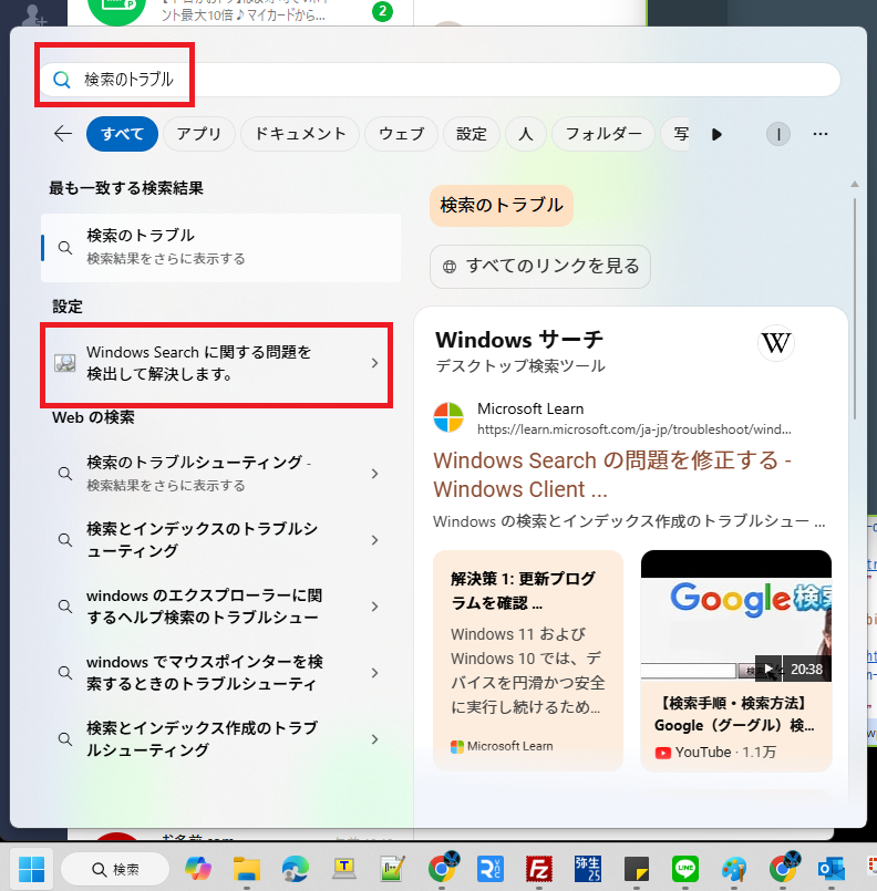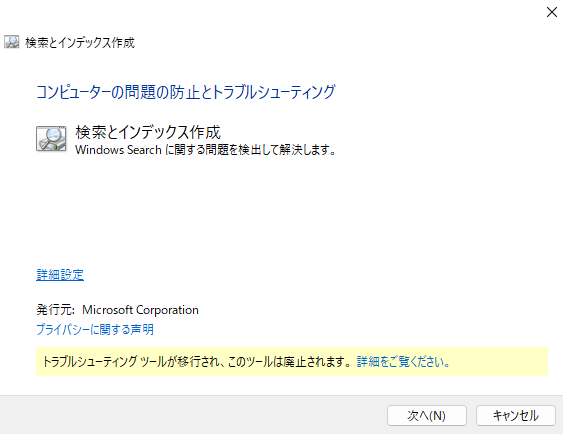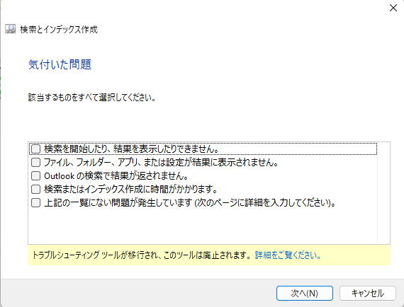 また、WindowsSerchのトラブルシューティングを実行してみます。
