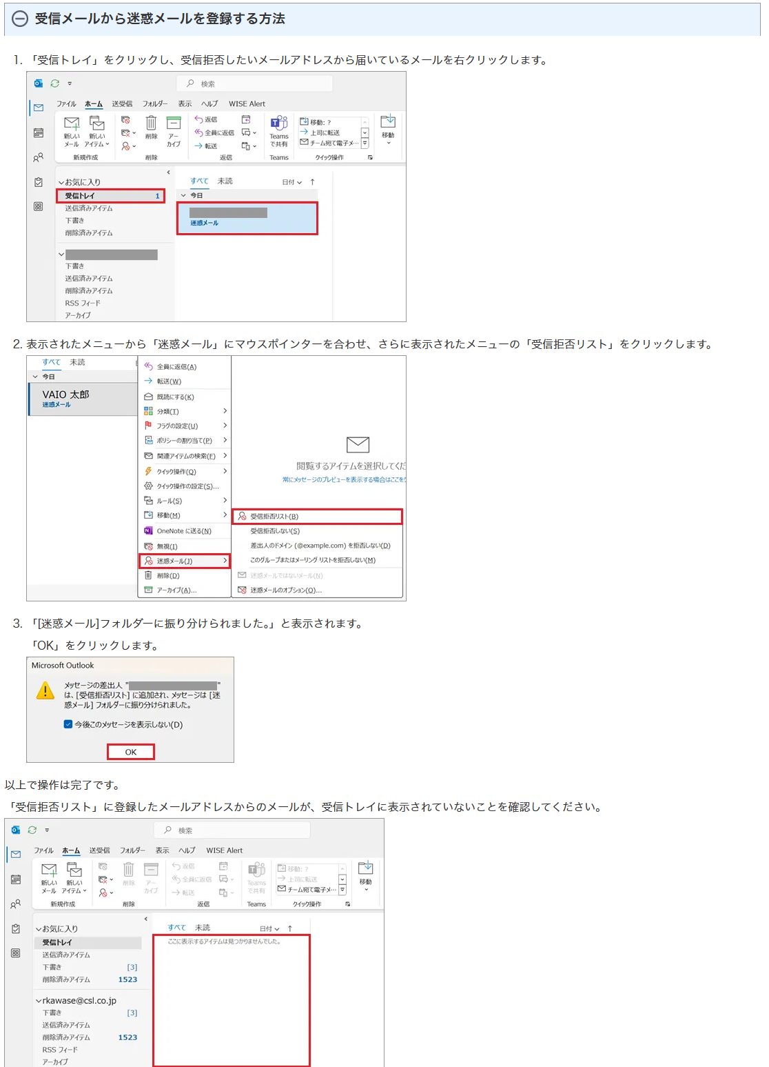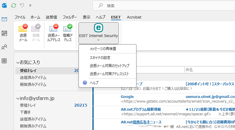 1:Outlookには迷惑メール振り分け機能がありますので、受信したメールに迷惑メール設定をします。