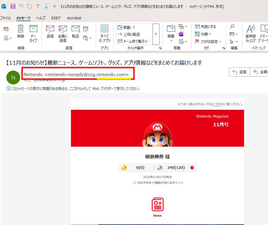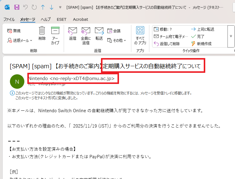 しかし、送信元はNintendoになっていますが、メールアドレスは「@omu.ac.jp」とわけのわからないアドレスになっています。