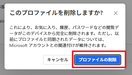 確認が出ますのでパスワードとお気に入りを保存していることを確認して「プロファイルの削除」をします。