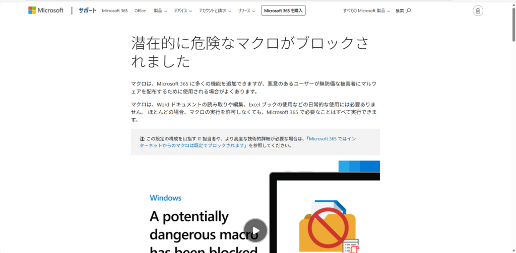 これは、インターネット(社内ネットワークも含む自身のPC以外)から取得した出所不明のファイルをむやみに開いてマクロによるウイルス感染の原因になることを防いでくれています。